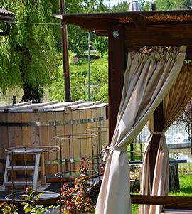 - Langa piscina sunt vestiare femei, barbati, cu grupuri sanitare si dusuri. In aceasta zona sunt amplasate doua pavilioane deschise, constructii pe structura lemn, avand forma si arhitectura caselor din zona, cu utilitatea de bar cu o capacitate de 30 de locuri respectiv cea de-a doua platforma pentru 4 mese de billiard.